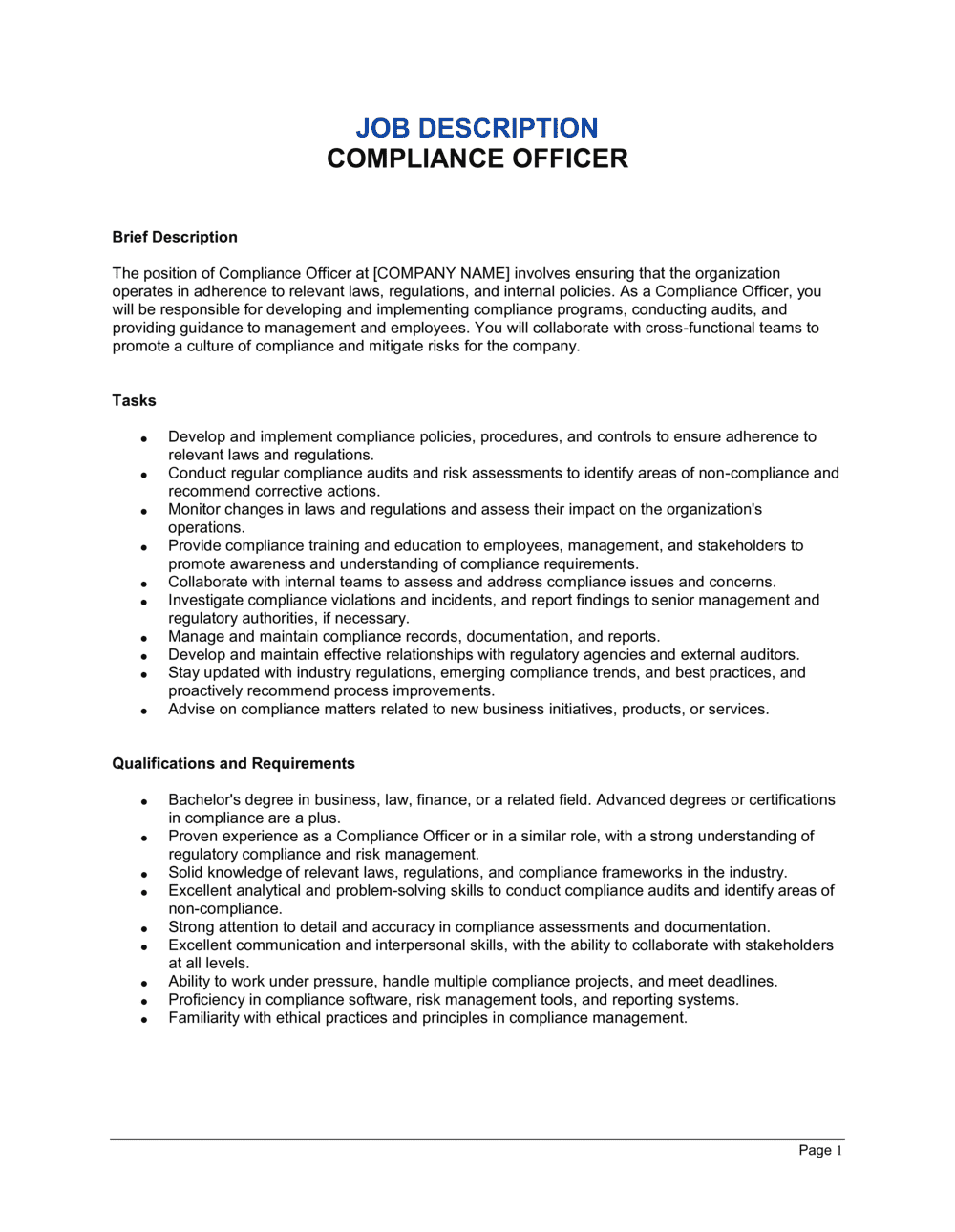 Compliance Officer Job Description Template
