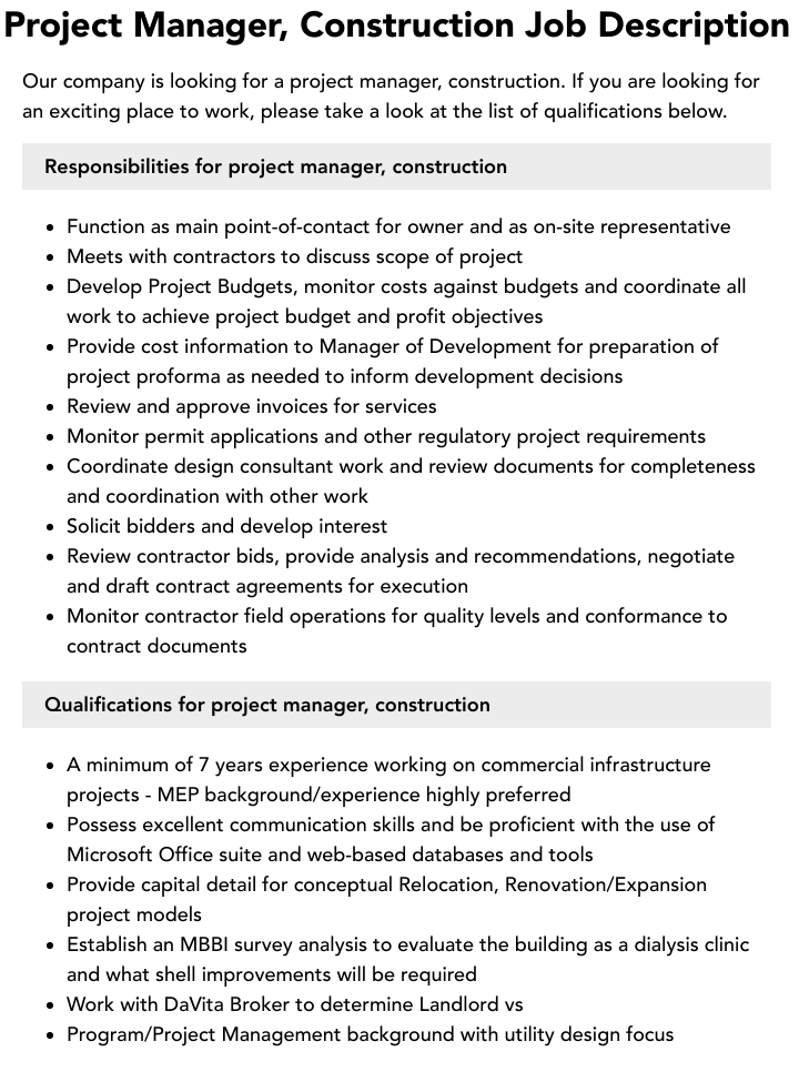 Construction Project Manager Job Description Template