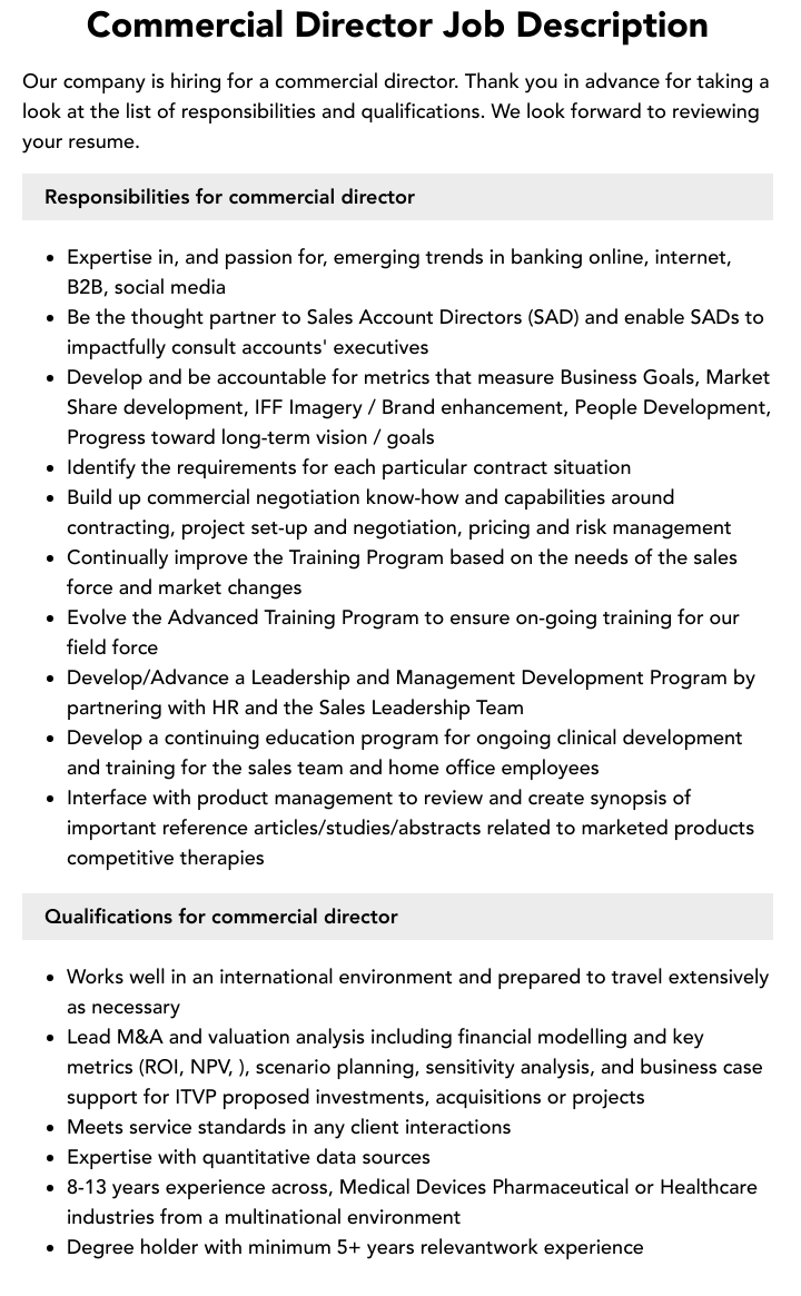 Finding the right leader to drive your company’s revenue growth and strategic commercial initiatives is a pivotal step for any thriving business. A clear and comprehensive commercial director job description ...