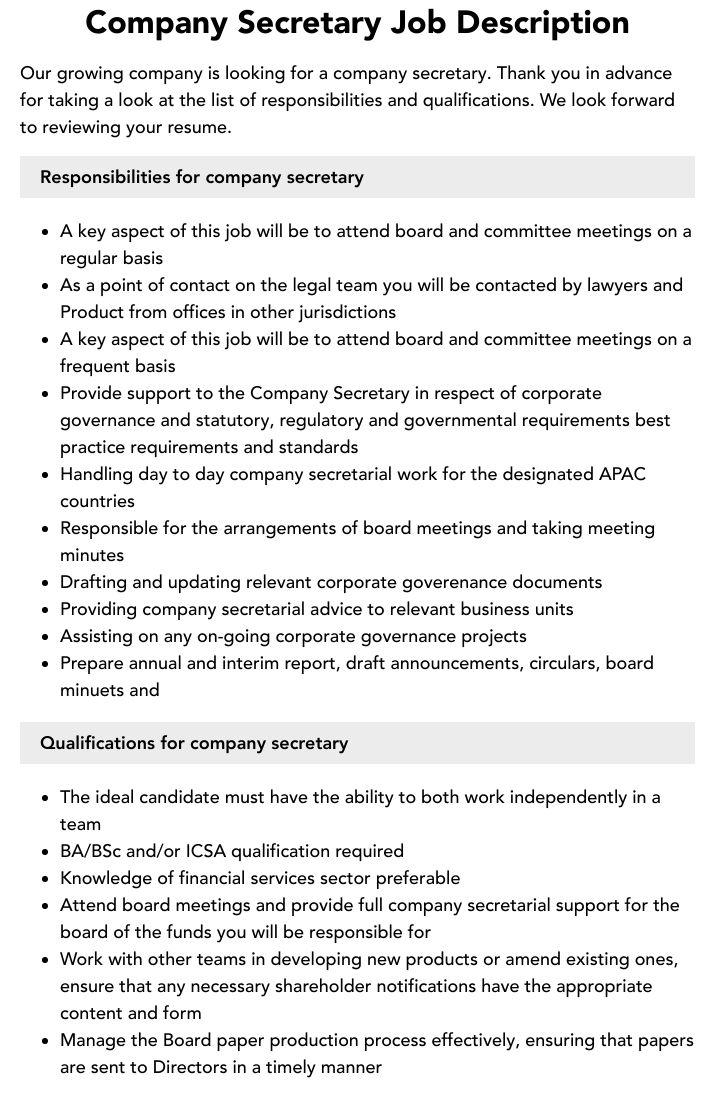 Company Secretary Job Description Template