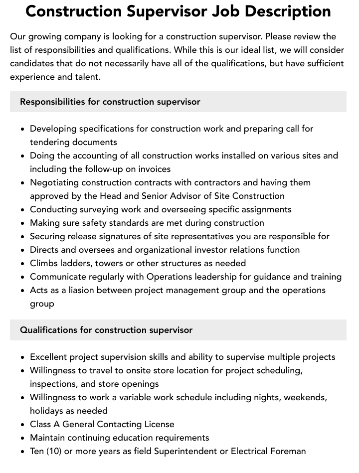 Construction Supervisor Job Description Template