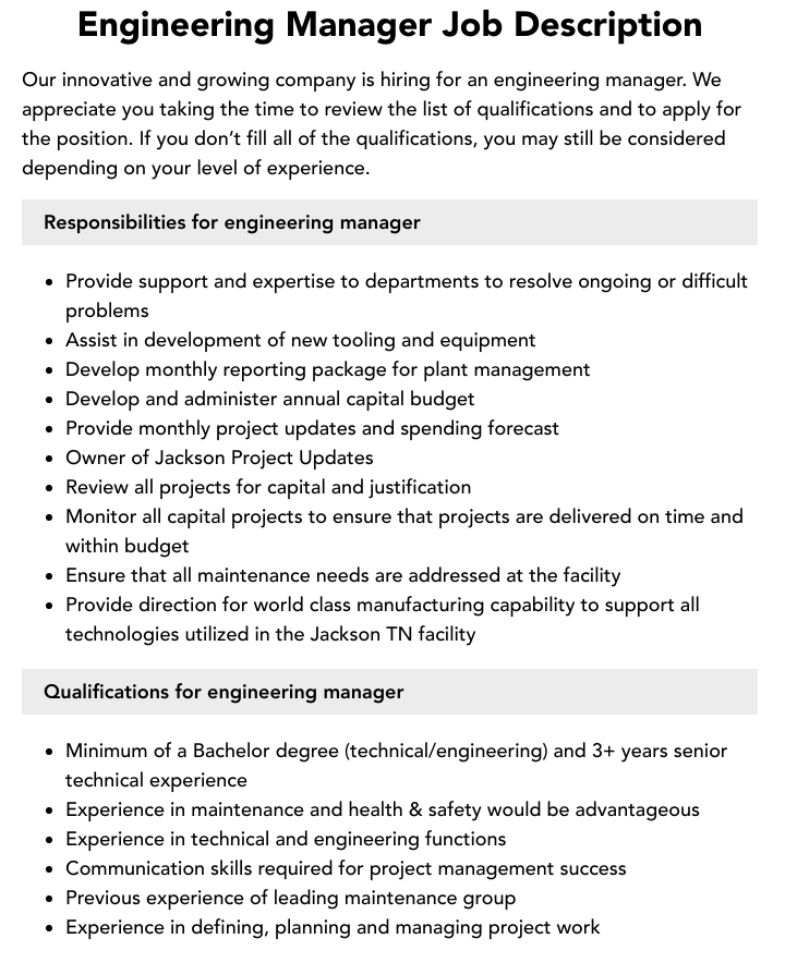Engineering Manager Job Description Template